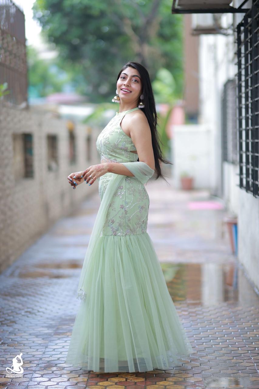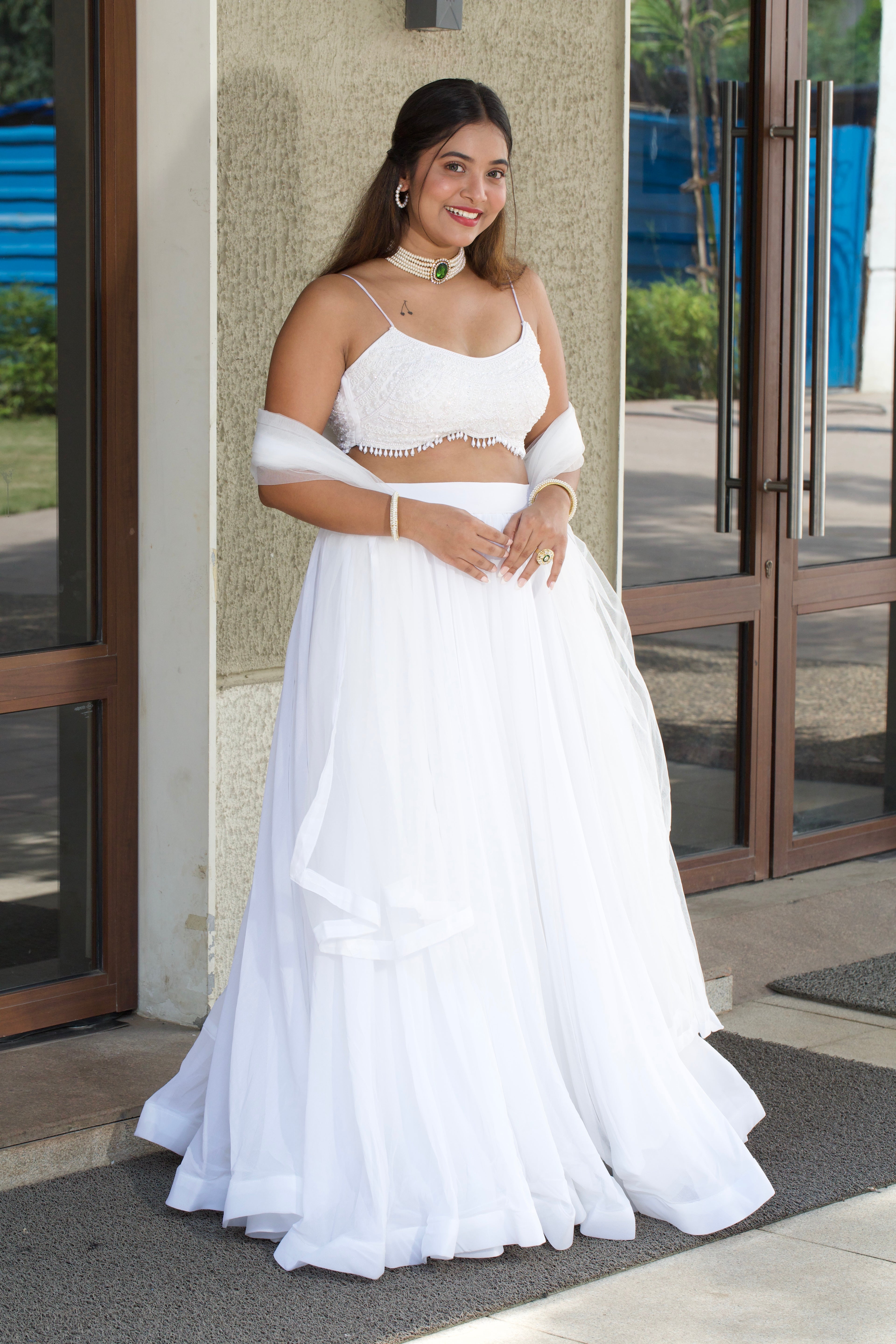 This elegant lehenga is the lehenga of your dreams. A tie in the back knot, combined with the gleaming straps, would make you stand out like no other. Make everyone jealous by posting videos of you twirling in this beauty.